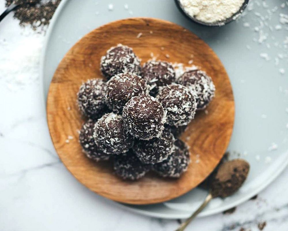 - Mit feuchten Händen 14 Kugel mit einem Gewicht von circa 30g formen (hier empfiehlt sich auch ein Eisportionierer) und in den Kokosnussraspeln rollen. Genießen!