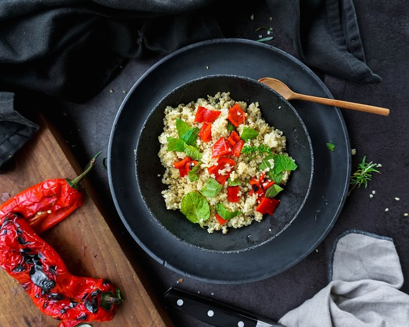 - Quinoa unter kaltem Wasser abbrausen, um Bitterstoffe auszuschwemmen und mit Wasser (siehe Packungsbeilage) in einem geschlossenen Topf zum Kochen bringen. Auf niedrigster Stufe ca. 15 Minuten köcheln lassen.